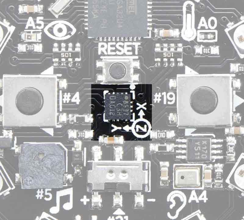 在 Adafruit 可穿戴编程开发主板 (Adafruit Circuit Playground Express) 上,accelerometer 加速度传感器位于主板中央,在右侧图片图示的位置。它是一个 LIS3DH(一个三轴:X、Y 和 Z 轴的)加速度传感器。加速度传感器在手机和其他一些便携电子设备中应用广泛,可以用来感知倾斜、重力、运动以及对设备的点击操作等。