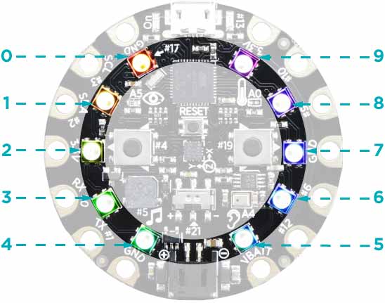 通过 colorLeds[i] 可以对指定编号 i 的彩色 LED 灯(霓虹灯)进行控制。在 Adafruit Circuit Playground 编程主板上有 10 个彩色 LED 灯,沿一周均匀分布在主板上,它们也被成为霓虹灯。编号及位置如右侧图片所示。
