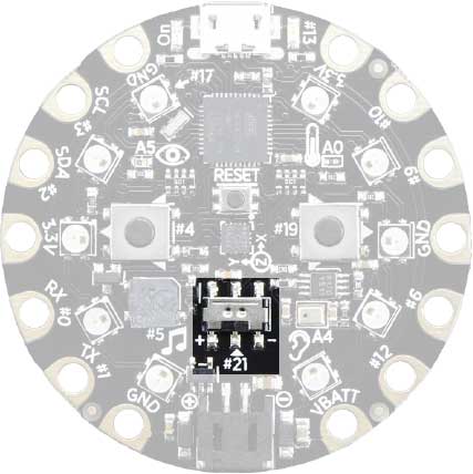 toggleSwitch 是用于控制 Circuit Playground 编程主板上开关的一个对象。在编程主板上,这个开关是跟引脚 #21 连接的。开关位于主板中央附近,在右侧图片图示的位置。toggleSwitch 对象即代表主板上的这个开关。