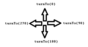 有时候在绘制图形之前,需要先将 turtle 画笔指定到某个方向。 turnTo(angle) 方法可以将 turtle 方向转到指定的方向,同时位置保持不变。0 度为垂直像素方向,延顺时针角度逐渐变大。